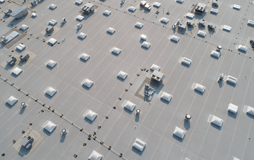 Membrane deterioration can be caused by rooftop equipment. Discharge from HVAC units and grease fans can be harmful to the roof system. Overflow from AC drainage pans can cause runoff that ponds on the roof, leading to deterioration and moisture infiltration.
