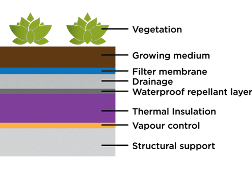 The plants and soil (or other material) sit on top of a synthetic waterproof membrane that protects the building from penetration of water, water vapour and roots.