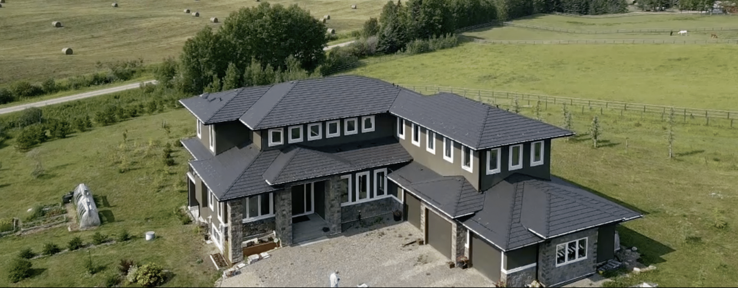 Set just outside the city in Priddis, this country home already had a great setting – open fields, big sky, and lots of room around it. Our Renoteck crew finished it off with an Iron Wood Shake metal roof in Charcoal Grey, wrapping the whole house and attached garage in one consistent, clean-looking system.