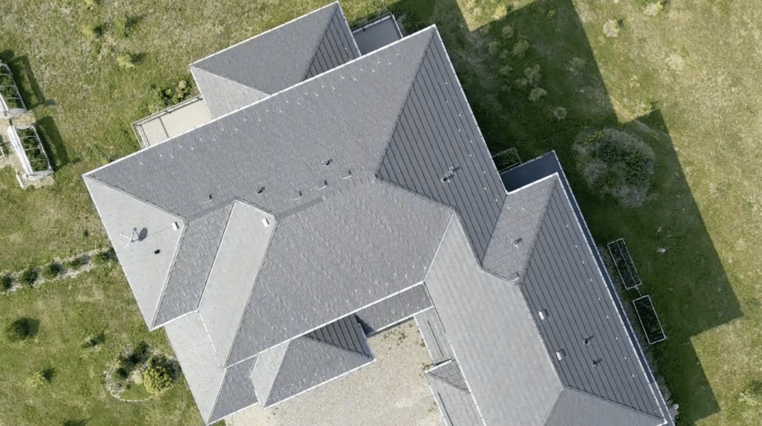 From above you can see how many hips, valleys and long runs this roof has – it would be a lot of stress for regular shingles. Metal shake handles it easily: interlocking panels stop wind from lifting edges, and the textured charcoal finish hides dust, pollen and anything the trees throw at it. In winter, the roof sheds snow evenly and protects all the warm spaces underneath, from the main living area to the garage and covered entries.