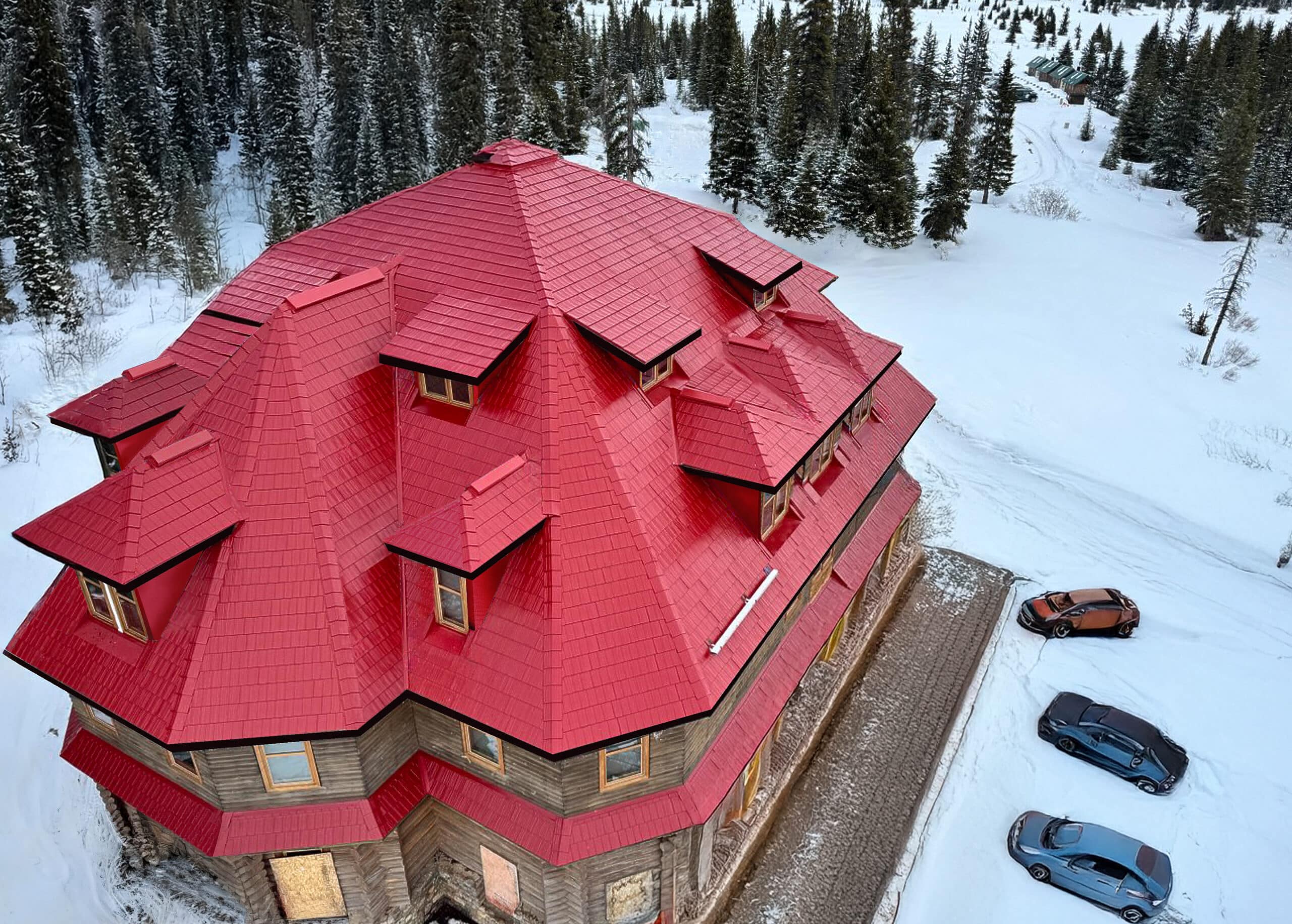 The Iron Wood Shake profile provides the classic look of cedar shake while delivering the long-term advantages of metal roofing. The red colour was carefully selected to complement the lodge’s mountain setting and historic character, while premium flashings, trims, and ventilation components were custom-fabricated to suit the complex roof geometry and multiple dormers.